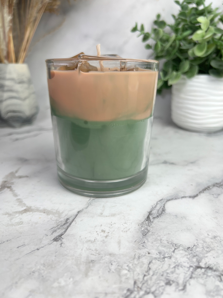 This candle captures the essence of an iced sugar cookie matcha latte. Its design mimics the refreshing taste and texture of the drink, making it a delightful sensory experience. Perfect for those who love the charm of a cold, aromatic beverage.